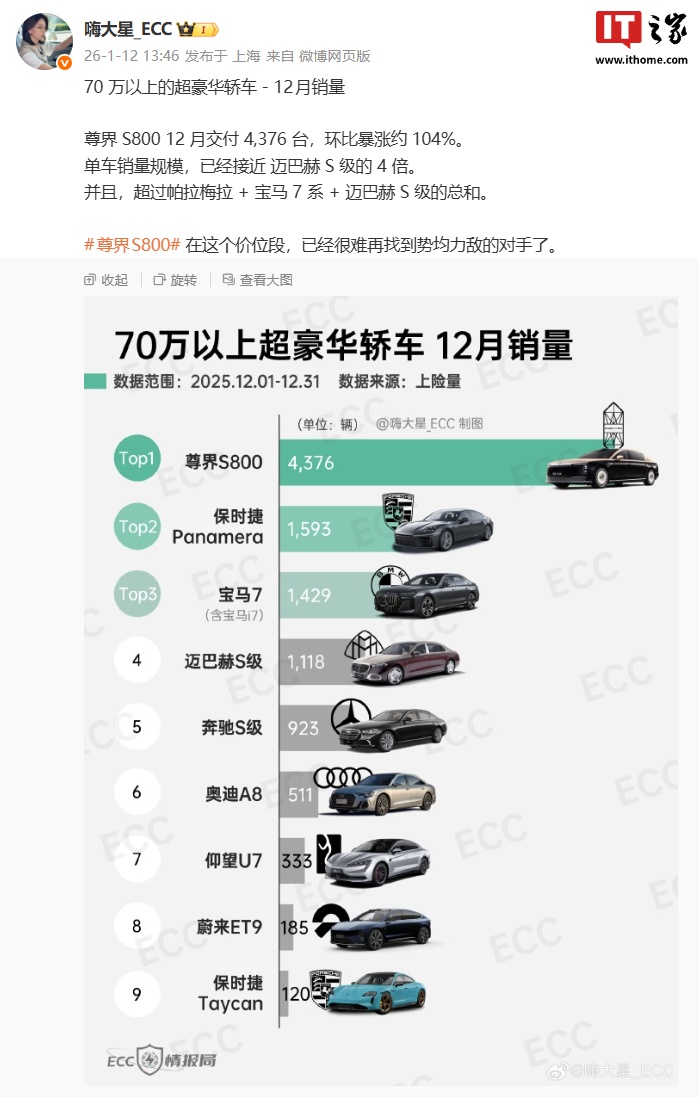 IT之家 1 月 12 日消息,博主 @嗨大星_ECC 今日分享了 70 万以上的超豪华轿车 12 月销量申银优配,其中尊界 S800 轿车交付 4376 台申银优配,环比暴涨约 104%。单车销量规模,已经接近迈巴赫 S 级的 4 倍,并且超过帕拉梅拉 + 宝马 7 系 + 迈巴赫 S 级的总和。